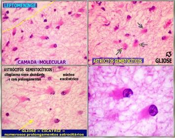 CAMADA MOLECULAR DO CÓRTEX CEREBRAL: ASTRÓCITOS GEMISTOCÍTICOS INDICAM QUE O PROCESSO INFLAMATÓRIO LESOU O TECIDO NERVOSO Meningite purulenta- cicatriz | |