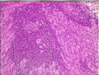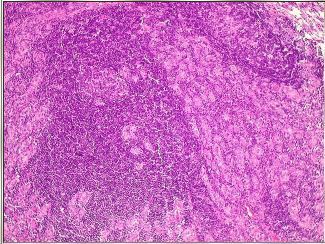 Tiroidite de Hashimoto (ou tiroidite autoimune). Tiróide mostrando, em pequeno aumento, intenso infiltrado linfocitário formando folículos linfóides com centros germinativos. Grande parte da área do corte é constituída por reação inflamatória. | |