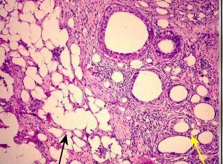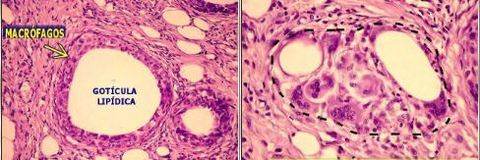 Granuloma Corpo estranho- adipócitos se romperam e liberaram gordura, e o corpo reage como se fosse um corpo estranho criando um granuloma em torno da gordura | |