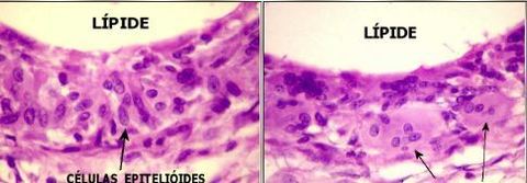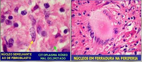 Célilas epitelióides (são as células que definem o granuloma) e gigantócito (do tipo Langhans) com núcleo organizado em ferradura na periferia (diferente da de corpo estranho que tem núcleos centrais desorganizados) | |