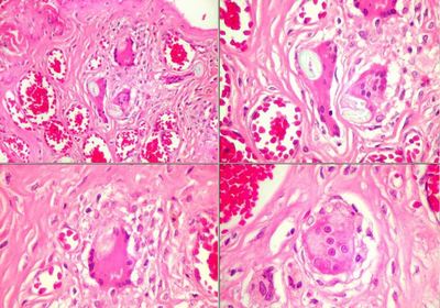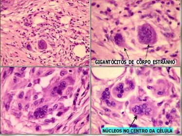 Granuloma de corpo estranho- presença de gigantócitos/células gigantes de corpo estranho como reação à um fio cirúrgico | |