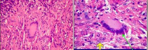 Seta Amarela: Cèlulas Epitelióides. Células Verdes: Gigantócito tipo Langhans (com seus núcleos organizados na periferia- tipo ferradura) | |