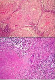 Seta de cima: Necrose caseosa no centro do granuloma, Seta de baixo: Gigantócitos do granuloma | |