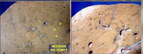 Hepatite Aguda com Necrose em Ponte (reação inflamatória intensa próxima aos vasos gerou necrose dessa região) | |