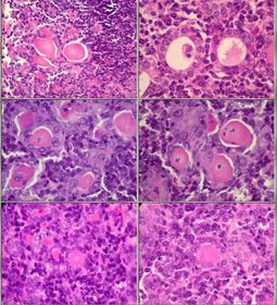 Nas lâminas de cima percebemos que o tecido linfóide normal diminui devido as áreas de necrose caseosa. Embaixo, vemos o granuloma com suas células caracterísitcas: células gigantes do tipo Langhars (ferradura) e células epitelióides | |