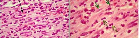 Apendicite aguda caracterizando exsudato fibrino purulento, na seta amarelo temos neutrófilo e na preta fibrina | |