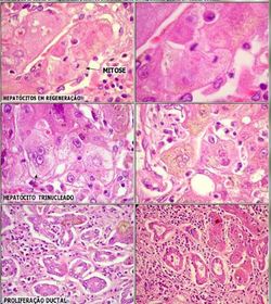 Mitose como forma de regeneração dos hepatócitos na hepatite viral aguda. Proliferação ductal também é observada | |