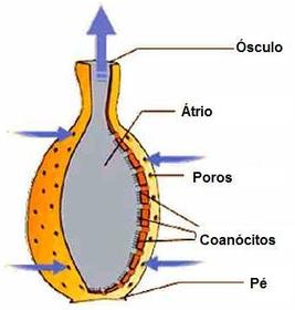 Quais são as principais partes da estrutura de uma esponja ? | Ósculo, Átrio, Poro |