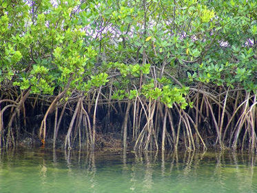 Manguezais Os mangues ocorrem em áreas da costa litorânea, de clima tropical e subtropical, em terrenos de solos formados por argila e barro e que alagam durante a maré alta. Vegetação formada por arvores e arbustos,com troncos finos e raízes aéreas | |
