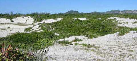 Restingas Conjunto de cobertura vegetal nos litorais. São áreas intensamente degradadas. Da vegetação típica, fazem parte: como a Bromélia,angelim da praia, cipó alto, etc. | |