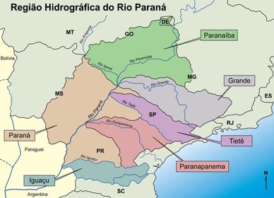 Região hidrográfica do rio Paraná | Caracteristicas distribuídos em sete unidades da federação: Minas Gerais, Goiás, Mato Grosso do Sul, São Paulo, Paraná, Santa Catarina e o Distrito Federal. O Rio Paraná é o principal curso d'água da bacia, mas de grande importância também são seus afluentes e formadores como os rios Grande, Paranaíba, Tietê, Paranapanema, Iguaçu, dentre outros. |