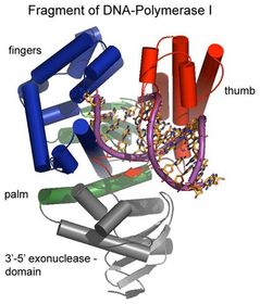 As exonucleases são enzimas que funcionam por clivagem de nucleótidos um de cada vez a partir da extremidade (eixo) de um polinucleótido de cadeia. | https://upload.wikimedia.org/wikipedia/commons/e/ef/Poly_I_structure.jpg |