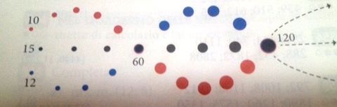 | Questa immagine mostra in rosso i multipli di 10, in nero quelli di 15 e in blu quelli di 12. Che cosa ti suggerisce? (EUREKA!) | I numeri rappresentati dai pallini nell'intersezione delle tre linee sono i multipli comuni di 10,12 e 15 |