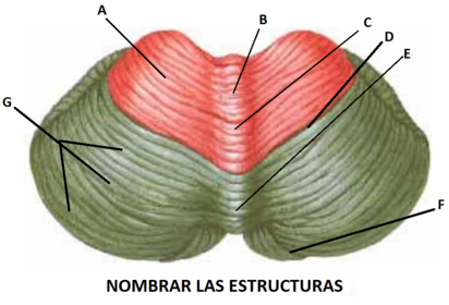| A. Lóbulo anterior B. Cara superior del vermis C. Culmen D. Fisura prima o primaria E. Declive F. Fisura Horizontal G. Lóbulo medio o posterior | |
