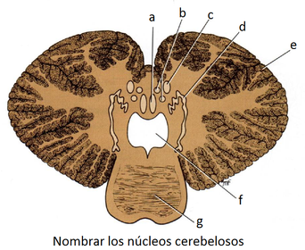 | a. Núcleo fastigio b. Núcleo globoso c. Núcleo emboliforme d. Núcleo dentado e. Hemisferio cerebeloso f. Cavidad del cuarto ventrículo g. Puente (protuberancia) | |