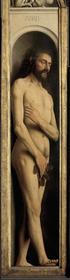 | JAN VAN EYCK "Het Lam Gods" (detail: Adam) 1432 (15de eeuw) => Vlaamse Primitieven: radicaal realistisch, blik = herinnering aan de zondeval => Adams voet: trompe-l'oeil | |