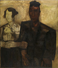 | CONSTANT PERMEKE "De verloofden" 1923 (20de eeuw) => Statisch, fel gecontrasteerde presentatie van de dualiteit tussen man en vrouw (kleuren, voorgrond/achtergrond, licht/stoer) => Synthese van de verloving (verstrengelde armen, vergeestelijkte boodschap) | |