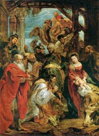 | PIETER PAUL RUBENS "De aanbidding der koningen" 1624 (17de eeuw) => Katholieke propaganda: glorie van de Kerk (krachtige, stralende koloriet, dramatische expressie, theatrale gevoelens, grillige compositie, bewogen lijn) | |