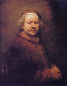 | REMBRANDT VAN RIJN "Zelfportret" 1669 (17de eeuw) => Laatste zelfportret: eerlijk, illusieloos, oude man getekend door het leven (grijze haren), wereldwijze schilder (geen behoefte om iets te bewijzen), schilderskiel en schildermuts, goudbruin (warmte), alla prima | |