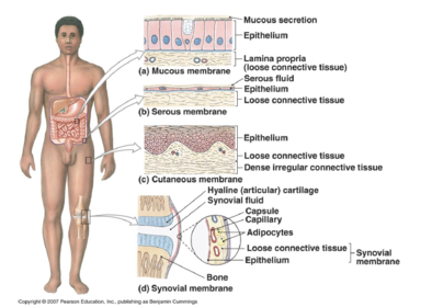 Membranas Tejidos que cubren o forran parte del cuerpo • Protegen • Capas de tejido epitelial con una capa de tejido conjuntivo subyacente. • Membrana Epitelial • Combinación de capas epiteliales y conjuntivas • Mucosa, Serosa, Cutánea (piel) • Membrana Sinovial • Delinea articulaciones y solo contiene tejido conjuntivo