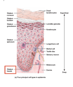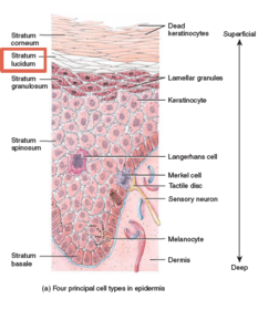 Epidermis Capa mas fina de la piel • Compuesta de tejido epitelial (escamoso estratificado). • 4 tipos de células • Queratinocitos • Melanocitos • Células de Lagerhans • Células de Merkel • Piel fina (4 capas) • Piel gruesa (5 capas) • Basal, Espinoso, Granuloso, Lucidum* y Corneo