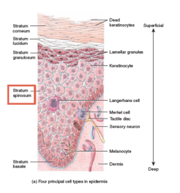 Capas Epidermales 8-10 capas de queratinocitos • Capas más superficiales son más aplanadas • Queratinocitos producen mucha queratina • Provee fuerza y flexibilidad a la piel. • Células: queratinocitos, langerhans y proyecciones de melanocitos