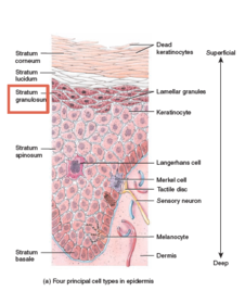 Capas Epidermales Estrato granuloso • 3 – 5 capas donde las células están pasando por apoptosis • Acumulación de queratina (proteína queratohialina) • Secreción de ‘gránulos lamelares’