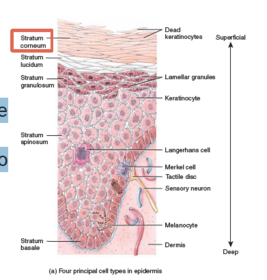 Capas Epidermales Estrato córneo • Capas más superficiales de queratinocitos muertos • Avg 25 – 30 capas, pero puede variar más • Células ya no contienen núcleo ni organelos • Muda constante de células
