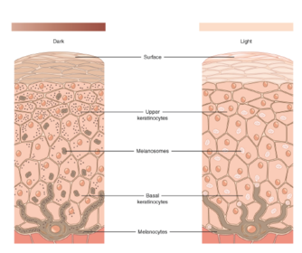 Color de Piel Melanina • Pheomelanin (amarillo ! rojo) • Eumelanin (marrón ! negro) • Mismo número de melanocitos, cambia la producción de melanina • Absorbe luz UV • Pecas: melanina acumulada en areas • Lunares: sobrecrecimiento de melanocitos • Age (liver) spots: melanina acumulada en areas debido a exposición a luz UV.