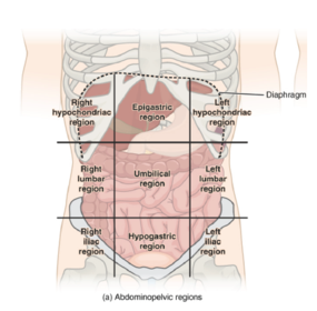 Regiones Abdominopélvicas 1. Hipocondrio derecho 2. Epigástrica 3. Hipocondrio izquierdo 4. Lumbar derecha 5. Umbilical 6. Lumbar izquierda 7. Ilíaca (inguinal) derecha 8. Hipogástrica 9. Ilíaca (inguinal) izquierda