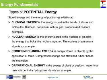 | What are the four different types of potential energy? | -Gravitational potential energy -Chemical energy -Elastic potential energy -Nuclear energy |