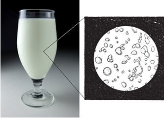 | O leite, por exemplo, é um coloide no qual vemos apenas uma fase branca; mas sob o olhar de um microscópico, percebemos que existem gorduras dispersas na água. | |