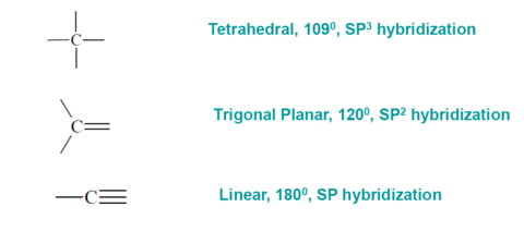 | Molecular geometry around carbon atom | Molecular geometry of carbon is determined by the bonding state. |