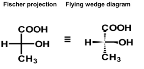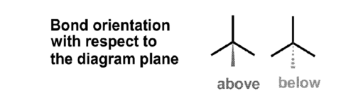 | Flying wedge representation | Solid line- atoms which lie in the plane of the paper Solid wedge- bonds towards you Hashed wedge- bonds away from you |