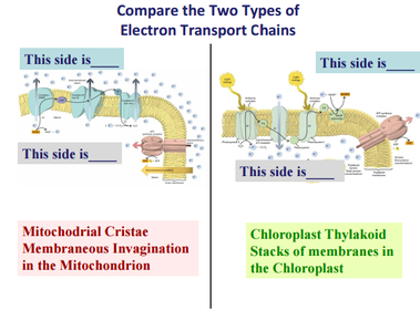 | Photosynthetic electron transport chain | • Takes place on the thylakoid membrane. • Connects the two photo systems. • Releases energy via chemiosmosis that the chloroplast uses to make ATP. • Produce reducing power in the form of NADPH •Oxygen is a byproduct |