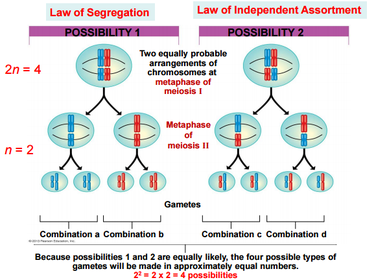 | 1. Mendel’s Law of Segregation | That organisms have two genetic elements which separate when gametes are formed. The fusion of gametes at fertilization pairs these elements once again Occurs during meiosis I: homologous chromosomes separation in anaphase I |
