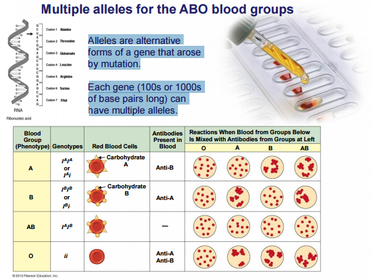 | Multiple alleles for the ABO blood groups | Alleles are alternative forms of a gene that arose by mutation. Each gene (100s or 1000s of base pairs long) can have multiple alleles. |