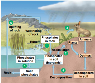 | The Phosphorus Cycle | Organisms require phosphorus as an ingredient of nucleic acids, phospholipids, and ATP and as a mineral component of vertebrate bones and teeth. • The phosphorus cycle does not have an atmospheric component. • Rocks are the only source of phosphorus for terrestrial ecosystems • Phosphates move from land to aquatic ecosystems much more rapidly than they are replaced. • Soil characteristics may also decrease the amount of phosphate available to plants. As a result, • phosphate is a limiting factor in many terrestrial ecosystems and • farmers and gardeners often use phosphate fertilizer, such as crushed phosphate rock or bone meal, to boost plant growth. |