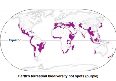 | Biodiversity “Hot Spots” | Conservation efforts are often focused on biodiversity hot spots, relatively small areas that have • a large number of endangered and threatened species and • an exceptional concentration of endemic species, those that are found nowhere else. • The “hottest” of Earth’s biodiversity hot spots are shown in Figure 20.37 |