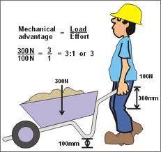 | A worker applies an effort of 100N to lift a rock of weight 300N using a wheelbarrow. Calculate the mechanical advantage of the wheelbarrow. | |