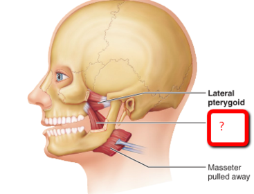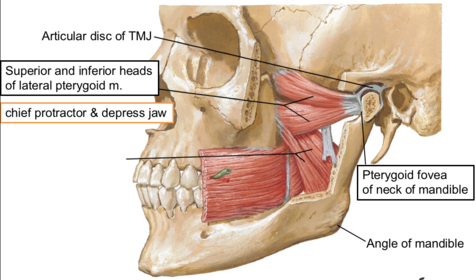 Name Origin: Insertion: Function: Innervation: | Lateral pterygoid Origin: Has two heads; the superior head originates from the infratemporal crest of the infratemporal surface of the greater wing of the sphenoid, the inferior head originates from the lateral surface of the lateral pterygoid plate. Insertion: Neck of the mandible, capsule and disc of the temporomandibular joint (TMJ). Function: Protrudes and depresses the mandible. Innervation: Lateral pterygoid nerve of mandibular (V3). |