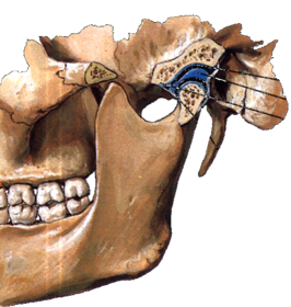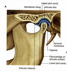 Temporomandibular joint Type of joint: Articular surfaces involved (3): Describe joint cavity and capsule: | Type of joint: This is a modified hinge type of synovial joint. The articular surfaces involved: The condyle of the mandible, the articular tubercle and the mandibular fossa of the temporal bone. An articular disc divides the joint cavity into superior and inferior compartments. The joint capsule is loose and attaches to the margins of the articular area on the temporal bone and around the neck of the mandible. Laterally, the capsule is thickened as the lateral ligament. Synovial membrane lines the capsule, superior and inferior to the disc. |