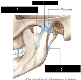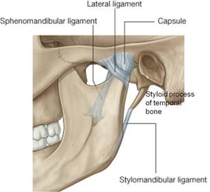 Temporomandibular joint Ligaments which attach mandible to cranium (3): | Laterally, the capsule is thickened as the lateral ligament. Stylomandibular ligament: runs from the styloid process to the angle of the mandible. Sphenomandibular ligament:: runs from spine of the sphenoid to the lingula of the mandible. |