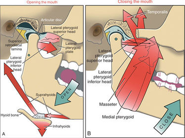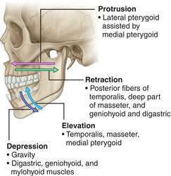 Temporomandibular joint: Muscles of elevation: Muscles of depression: Muscles of protraction: Muscles of retraction: | |