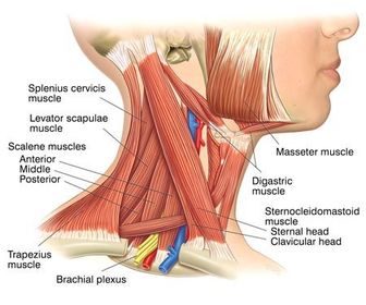 Name Origin: Insertion: Function: Innervation: | Sternocleidomastoid Origin: From the lateral aspect of the mastoid process and the lateral half of the superior nuchal line. Insertion: Two heads; the sternal head inserts into the upper anterior surface of the manubrium of the sternum. The Clavicular head inserts into the superior surface of the medial third of the clavicle. Function: Unilateral: flex the neck and rotate the neck so that the head faces superiorly to the opposite side. Bilateral: bring the head forward. Innervation: Spinal root of accessory nerve (cranial nerve 11) providing motor fibres and C2 and C3 providing sensation. |