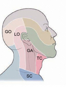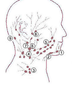 Superficial lymph nodes: 1, 2, 5, 6, 8, 9 (9 is 2 nodes together). | The superficial lymph nodes are: Occipital (9), retroauricular (9), parotid (8), buccal (5), submental (1), submandibular (2) and superficial cervical (6); drain into the deep cervical nodes. |