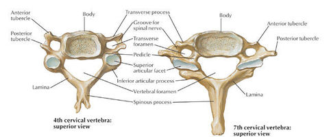 Cervical vertebrae Number typical/atypical: Characteristics of typical (body, vertebral foramen, transverse process and spinous process): | Cervical vertebrae: C1-C7. They are typical vertebrae except for atypical C1 and C2. Characteristics: Body: Small and longer from side to side than anteroposteriorly; superior surface is concave and inferior surface is convex. Vertebral foramen (canal): Large and triangular. Transverse processes: Transverse foramina (small or absent in C7); vertebral arteries pass through, except C7. Spinous process: Short and bifid; process of C7 is long (vertebra prominens). |