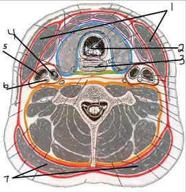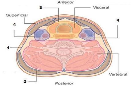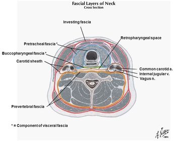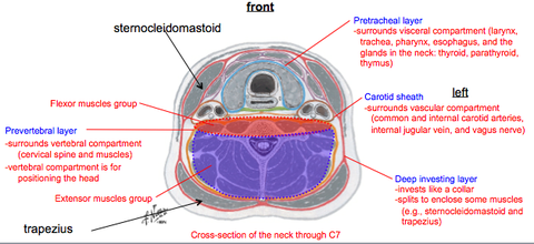 Deep fasciae of the neck Name of and structures enclosed by layers (3): | Deep fasciae of the neck: 3 layers: 1. Investing layer of cervical fascia: Surrounds all structures in the neck and lies between the superficial fascia and muscles. Splits to enclose the SCM and trapezius muscles. 2. Pretracheal fascia: Limited to the anterior part of the neck. Lies deep to the infrahyoid muscles and splits to enclose the thyroid, trachea, pharynx and oesophagus. 3. Prevertebral fascia: Forms a tubular sheath for the vertebral column and the muscles associated with it. |