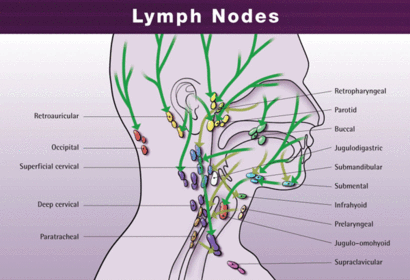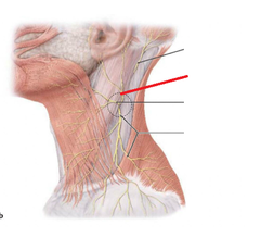Lymphatic drainage of the face Routes (3): Final route: Other deep lymph nodes (4): | Lymphatic vessels in the forehead and anterior part of the face accompany other facial vessels and drain into the submandibular lymph nodes, located along the inferior border of the mandible. From the lateral part of the face lymph drains into parotid nodes. Lymphatic from the central part of the lower lip and chin drain into submental nodes. All lymph from the head and neck eventually drains into the deep cervical lymph nodes. The main group is situated beneath the sternocleidomastoid muscle and forms a chain along the internal jugular vein. Other deep nodes include prelaryngeal, pretracheal, paratracheal and retropharyngeal nodes. |
