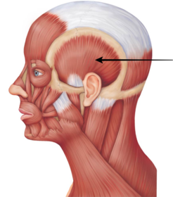 Name Origin: Insertion: Function: Innervation: | Temporalis Origin: Floor of the temporal fossa and deep surface of the temporal fascia. Insertion: Coronoid process and anterior border of the ramus of the mandible. Function: Raises the mandible and posterior fibres can retract/retrude the mandible. Innervation: Deep temporal branches of the mandibular (V3). |